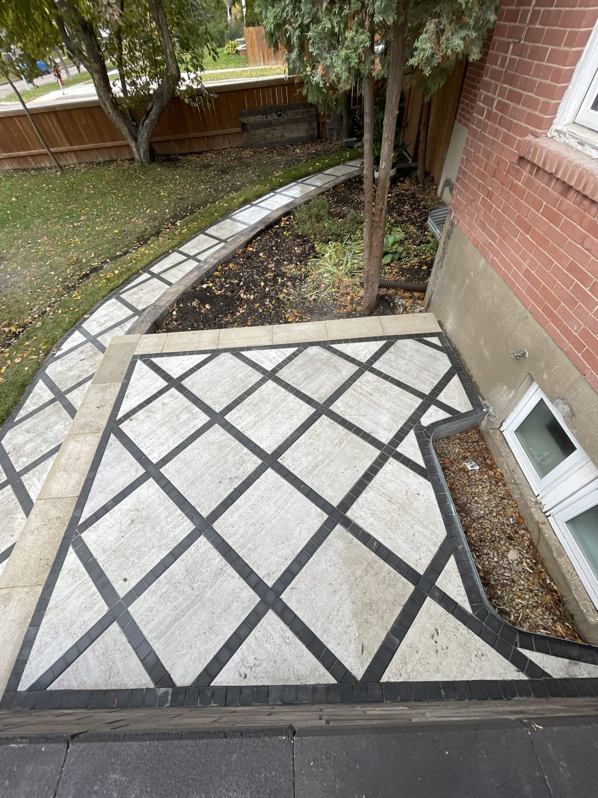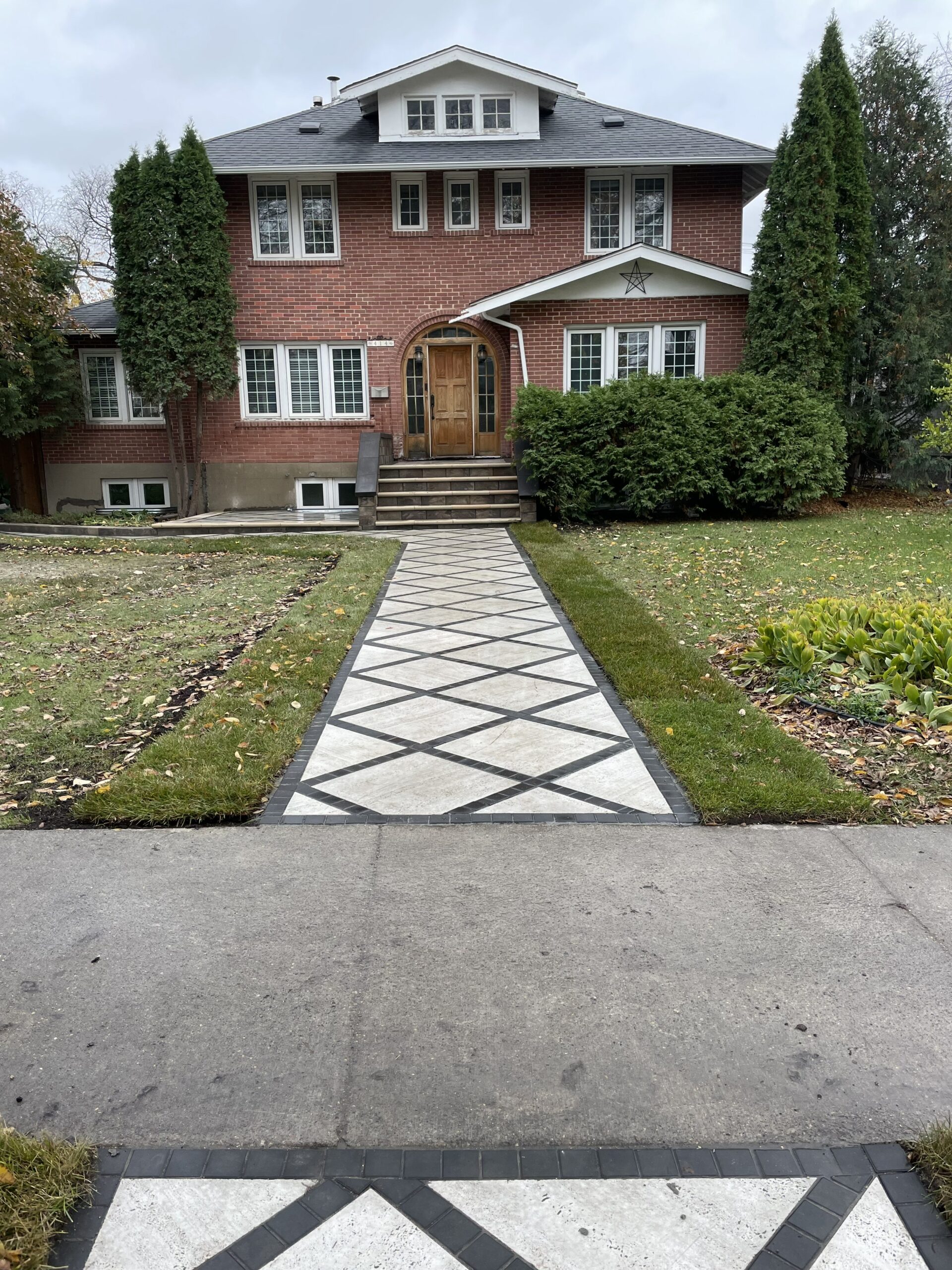 We laid a custom diamond-pattern interlock walkway the full length from the street. Large-format light grey slabs set on the diagonal, separated by tight charcoal grid lines, bordered clean on both sides.