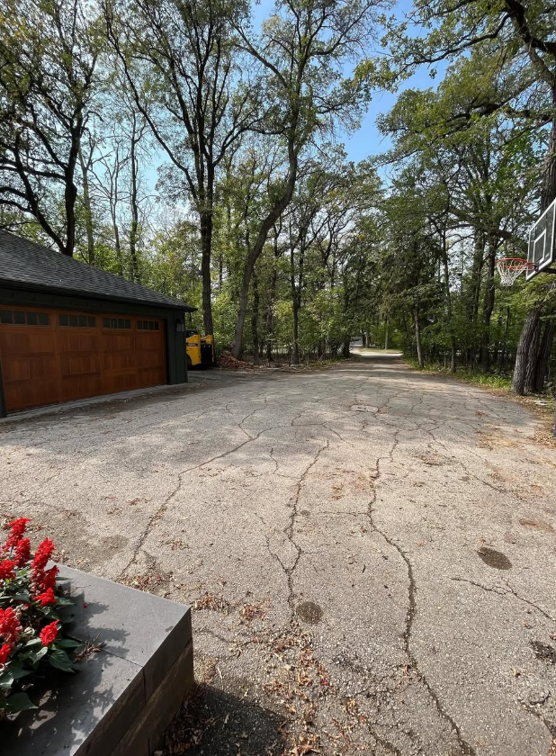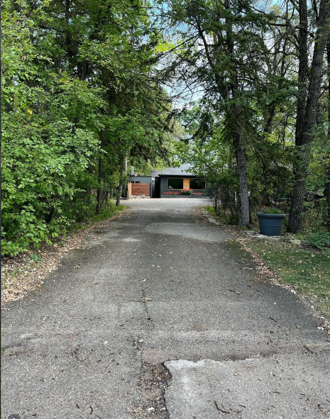The house was dark, modern, cedar accents, mature trees overhead. It had everything it needed to make a first impression. The driveway did not.