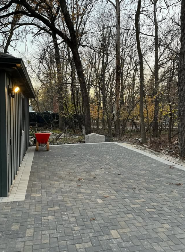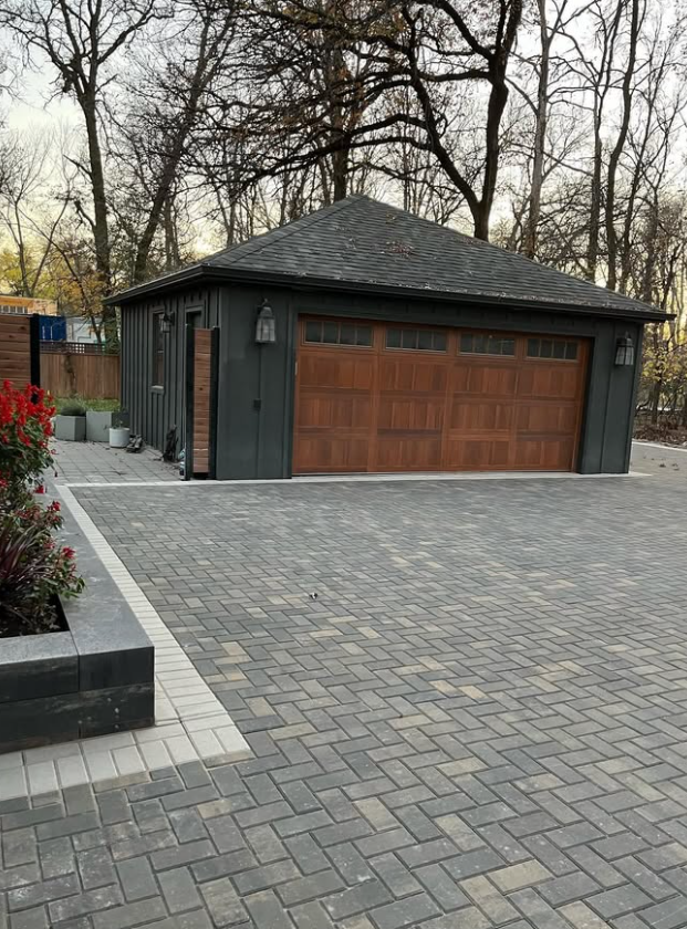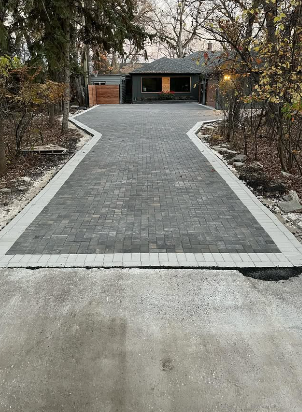 We pulled out the old asphalt and started fresh. Holland pavers, charcoal and grey, running bond pattern, white border wrapping the entire perimeter — including a sweeping curved corner that follows the natural line of the property.